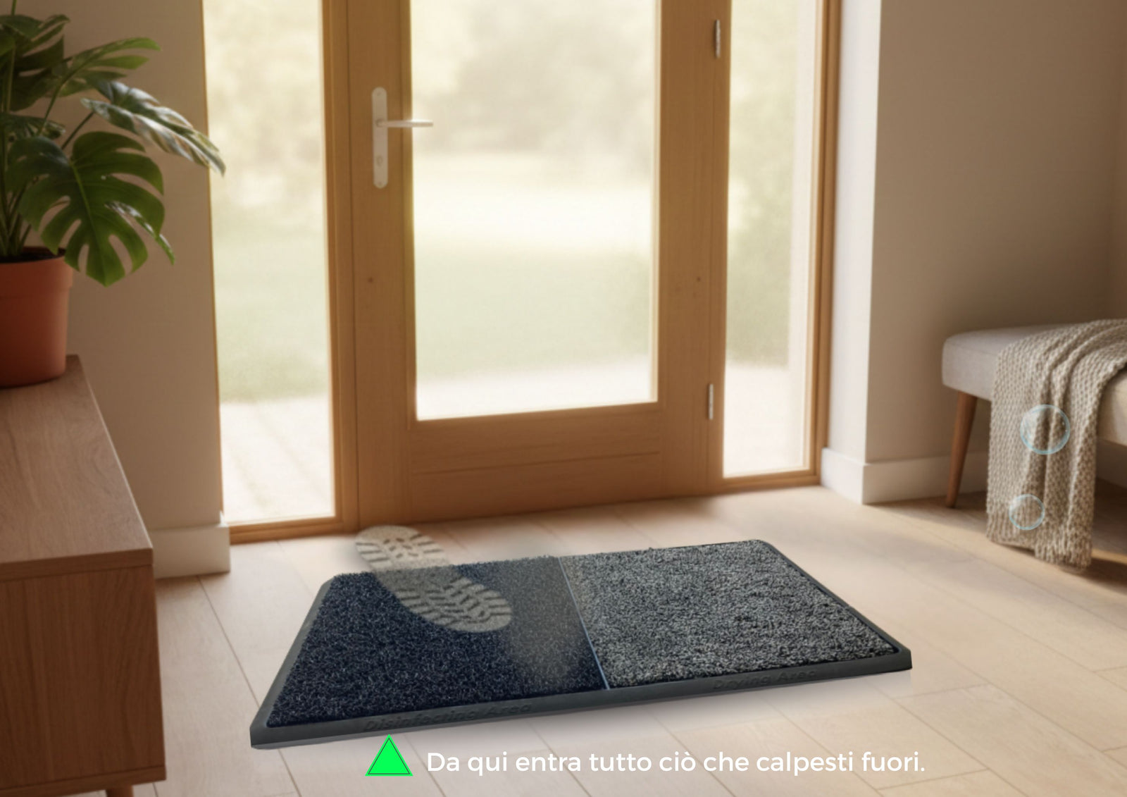 Il tappeto igienizzante disinfetta le suole delle scarpe. Blocca sporcizia, batteri e allergeni prima che entrino in casa o in azienda.